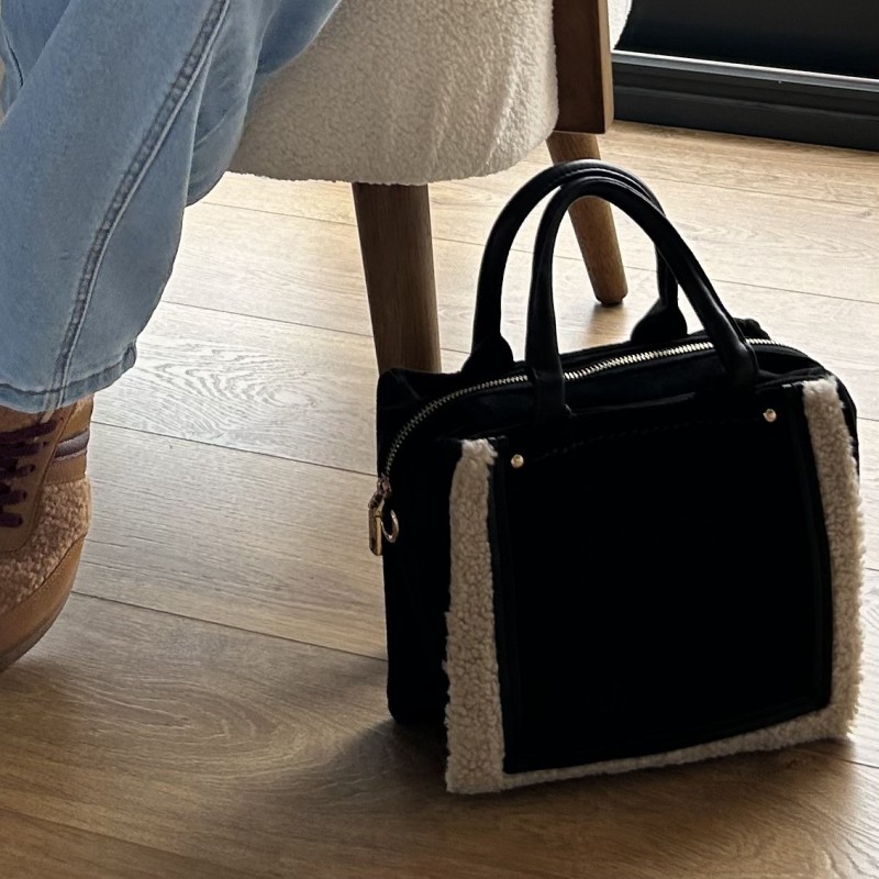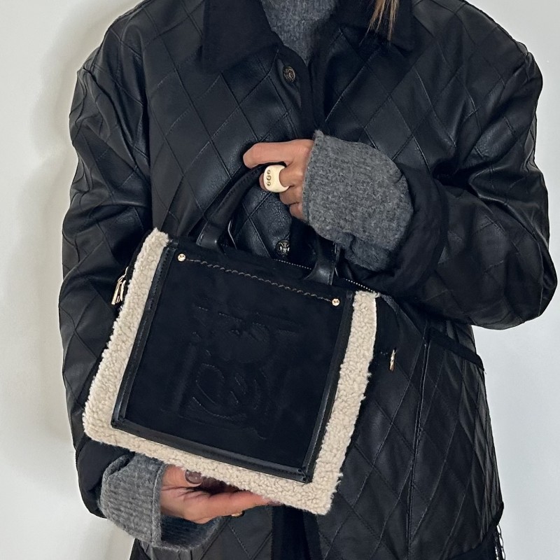 Alliez élégance et modernité avec le sac LISIA, un modèle iconique qui sublimera toutes vos tenues hivernales. Confectionné en suédine noire texturée, il se distingue par ses bords en fausse fourrure effet shearling.