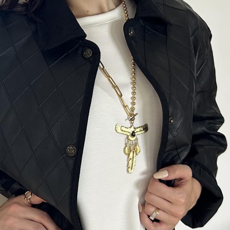 Le collier LISIA doré à pendentif aigle apporte une touche audacieuse et symbolique à vos tenues. Parfait pour sublimer un look minimaliste ou ajouter du caractère à une tenue chic.