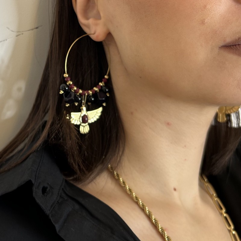 Affirmez votre style avec les boucles d'oreilles AIGLE ! Créoles élégantes ornées de perles dorées, bordeaux et noires, sublimées par un pendentif aigle audacieux. Chic, uniques et irrésistibles, elles ajoutent caractère et glamour à toutes vos tenues.
