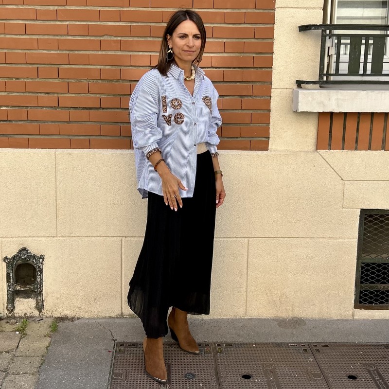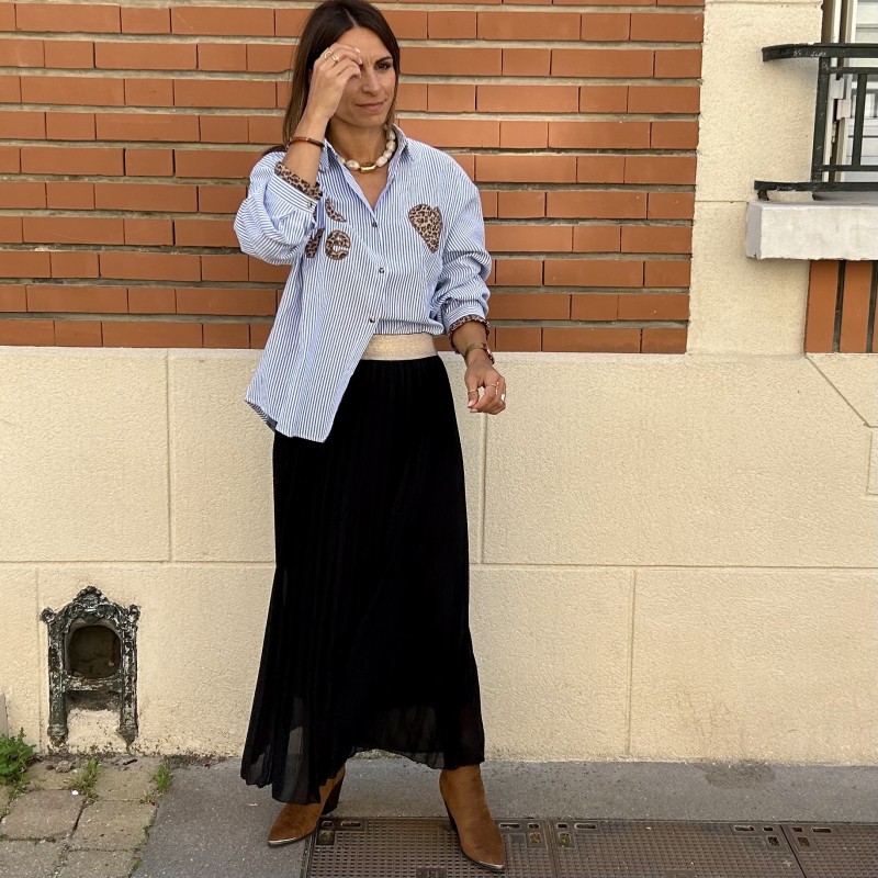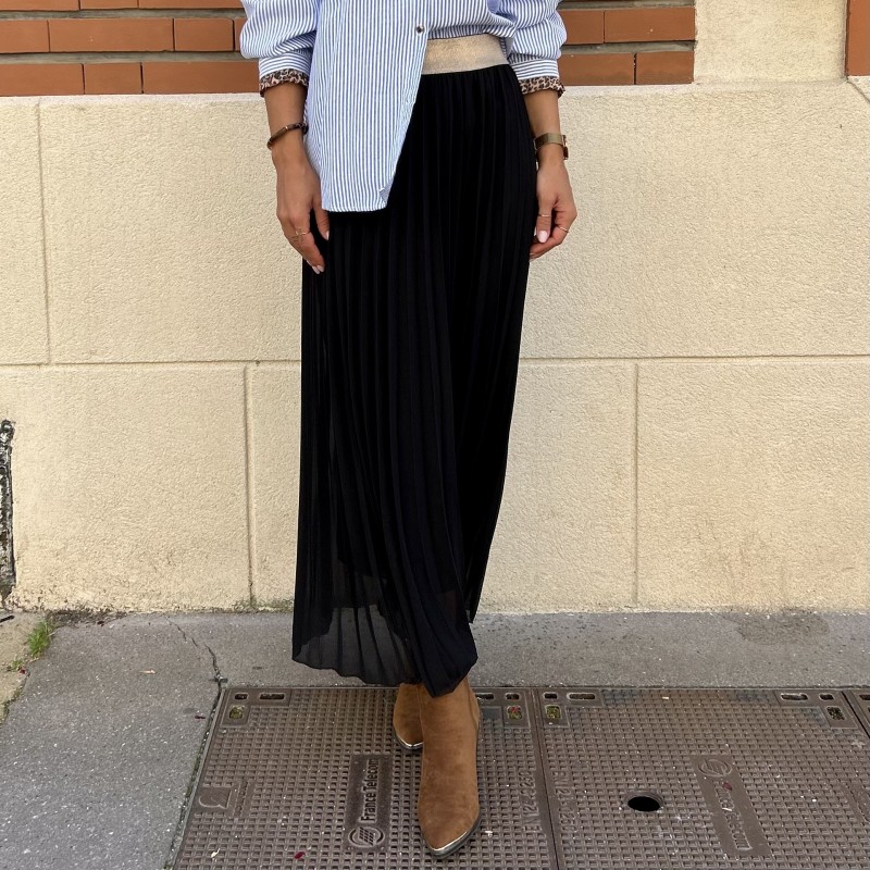 La jupe longue Jalba noir 100% esprit bohème. On craque pour son volume et sa taille élastique doré ultra confort. À porter avec une chemise L'Audacieuse, le look est canon.