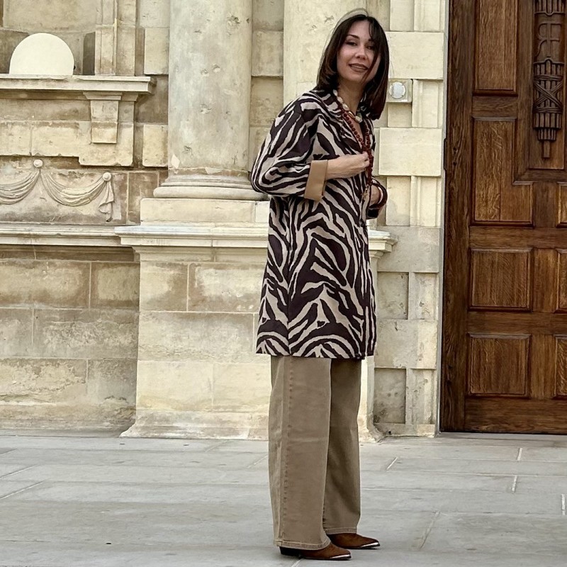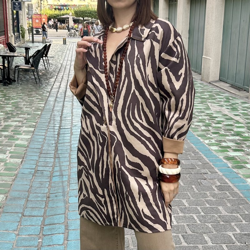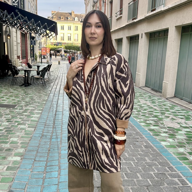 La veste ALANA mélange d'allure chic et audacieux. En suédine avec son col chemise et son côté zébré noir et beige qui lui donne une note unique.